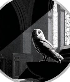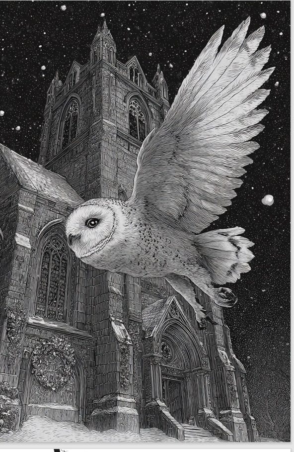 “What do you mean?” the Vicar began. “It’s as plain as...” but then his voice trailed off. The owl was gone. He stumbled through his sermon but no one was listening. They were all staring at a feather dancing in the unfelt breeze just above his head.
